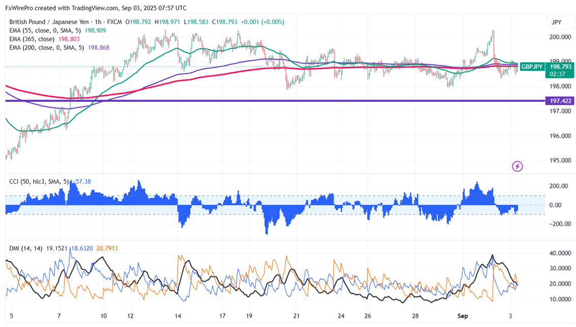 The pair is trading below 55 and 200 EMA and 365 EMA (long-term) on the 1-hour chart, confirming a bearish trend. Any violation below 198.40 indicates the intraday trend is weak. A dip to 198/197.85/197.25/ 196.70/196.20/195 is possible. Immediate resistance is at 199.30 a breach above this level targets 200.28/202.