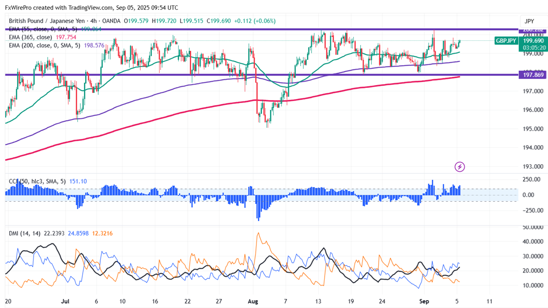 The pair is trading above 55 and 200 EMA and 365 EMA (long-term) on the 1-hour chart, confirming a bullish trend. Any violation below 199.20 indicates the intraday trend is weak. A dip to 198.75 198/197.85/197.25/ 196.70/196.20/195 is possible. Immediate resistance is at 199.75; a breach above this level targets 200.28/202.