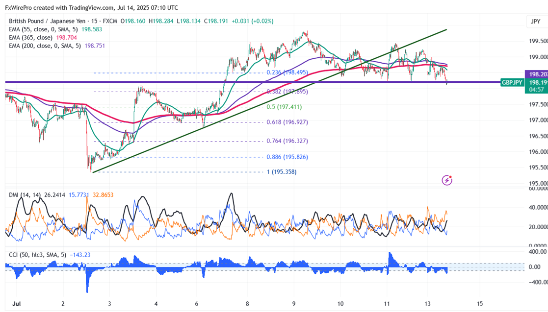 ‘The GBP/JPY pair is trading below 55 and above 200 EMA (Short-term) and 365 EMA (long-term) on the 15-min chart, confirming a bearish trend. Any violation below 198 indicates the intraday trend is weak. A dip to 197.70/196.70/196.25/195.25/194/193.70 is possible. Immediate resistance is at 200, a breach above this level targets 202/204.
