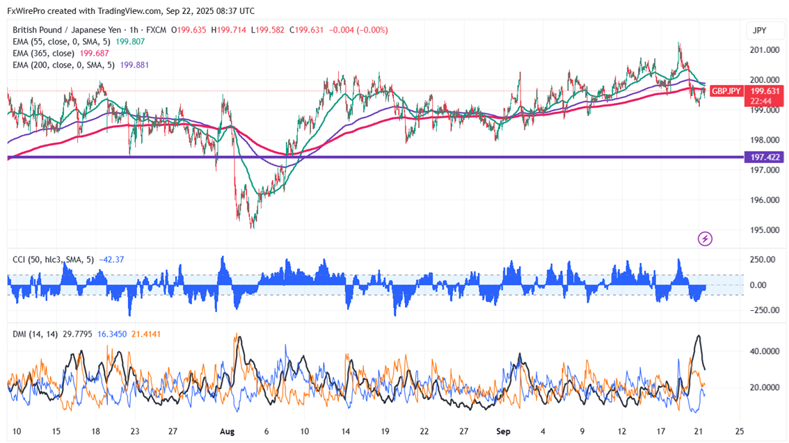 The pair is trading below 55, 200 EMA, and 365 EMA (long-term) on the 1-hour chart, confirming a bearish trend. Any violation below 199 indicates the intraday trend is weak. A dip to 198.75 /198/197.85/197.25/ 196.70/196.20/195 is possible. Immediate resistance is at 200 a breach above this level targets of 200.53/201.26/ 202/203.