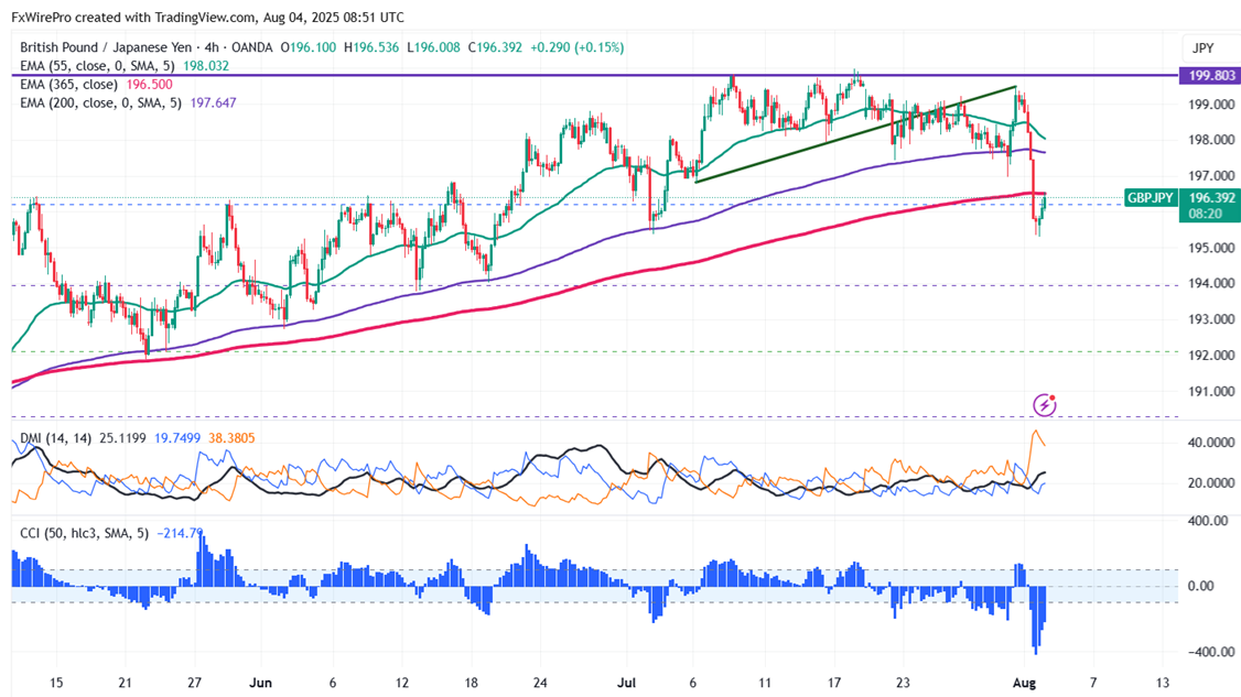 The GBP/JPY pair is trading below 55 and above 200 EMA (Short-term) and 365 EMA (long-term) on the 4-hour chart, confirming a weak trend. Any violation below 196 indicates the intraday trend is weak. A dip to 195.25/194/191.95/190 is possible. Immediate resistance is at 196.75, a breach above this level targets of 197.35/198/198.85/199.30/200/202/204.