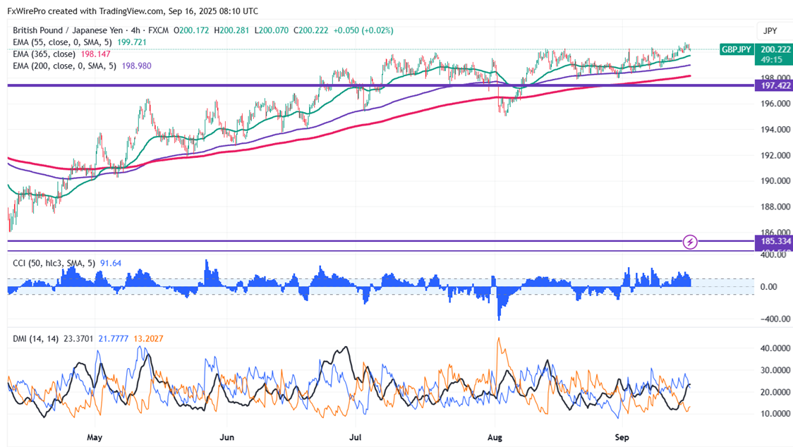The pair is trading above 55 and 200 EMA and 365 EMA (long-term) on the 4-hour chart, confirming a bullish trend. Any violation below 199.50 indicates the intraday trend is weak. A dip to 199.20/198.75 /198/197.85/197.25/ 196.70/196.20/195 is possible. Immediate resistance is at 200.75; a breach above this level targets 202/203.