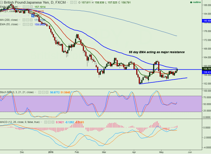 - On the higher side any break above minor resistance 159.05 (55 day EMA) will take the pair to next level till 160.35/161.70/162.70.