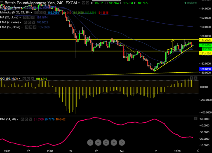 - The pair's major resistance is around 187.33 and any break above will take the pair further up till 188/189.90.