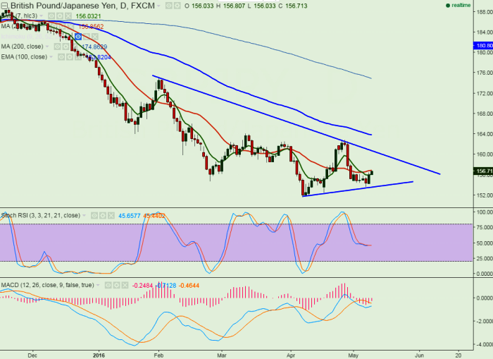 - The pair has been consolidating between 156.66 and 153.63 for the past six trading session. GBP/JPY has violated above 156.71 (21 day MA) and jumped till 156.80. It is currently trading around 156.68.