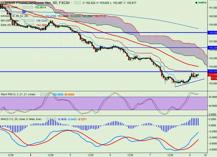 - GBP/JPY has broken major intraday resistance 153 and jumped till 153.23 at the time of writing .It is currently trading around 153.21.