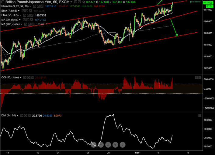 GBP/JPY breaks major trend line resistance 187.56 and a slight jump till 188.25/188.50 is possible .