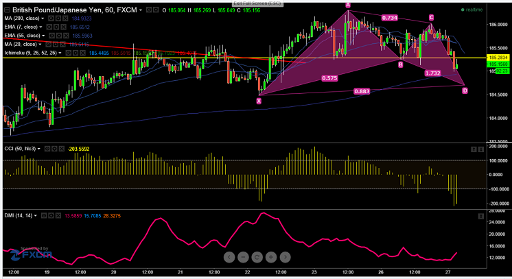 - On the higher the pair is facing major resistance around 186.30 and break above confirms further bullishness , a jump till 187/187.45 is possible .