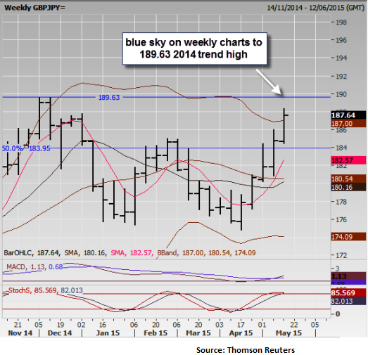 Bollinger's, momentum studies, 5, 10 & 20 dma's track north Initial support at 185.98 (5 dma) and resistance at 188.37, 189.63