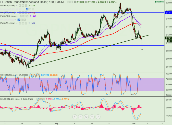- GBP/NZD breaks below trend line resistance today morning and declined till 2.1072. It is currently trading around 2.11036.