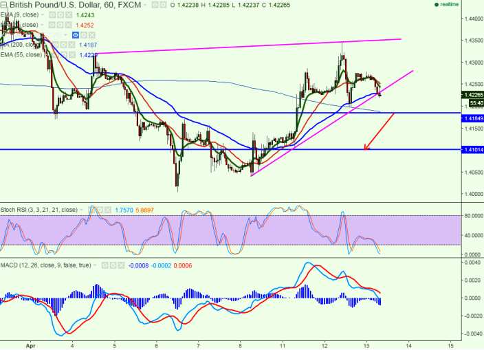 - Cable has recovered yesterday after making a low of 1.41965 (near 200 HMA) .It is currently trading around 1.42391.