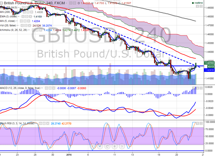 - The pair has broken major resistance around 1.4250 and jumped till 1.42725 at the time of writing. Any break above 1.4250 will drag the pair up till 1.4300//1.4326 (55 day 4 EMA)/1.4340 level in short term.