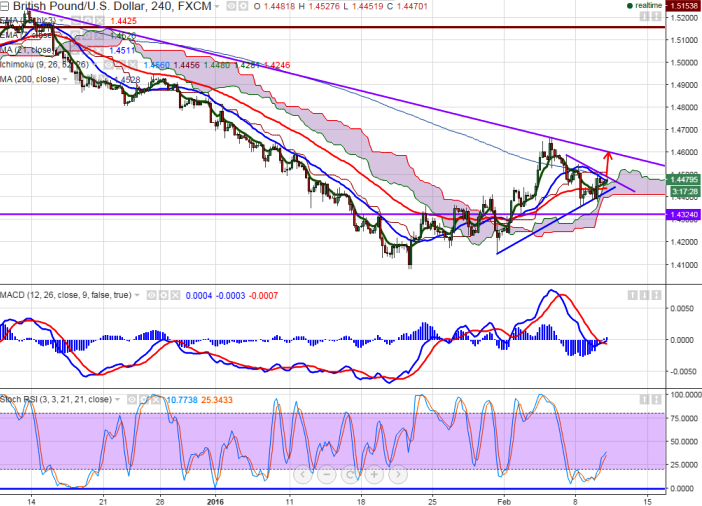 - The pair is facing strong resistance around 1.4490 and break below confirms minor trend reversal, a jump till 1.4580/1.4600 is possible.