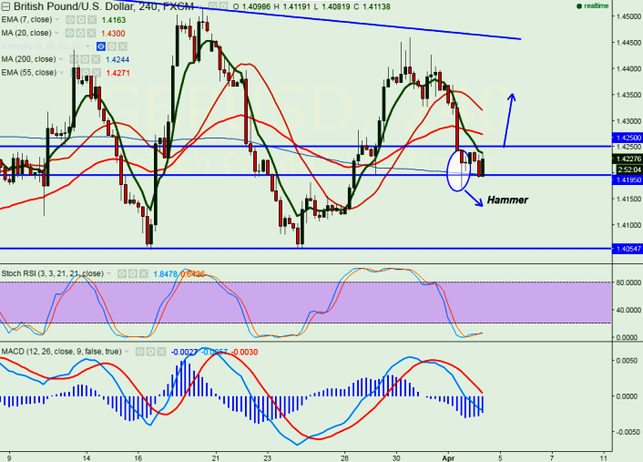 - On the higher side major resistance is around 1.4250 and any indicative break above will take the pair 1.4320/1.4360 ins short term.