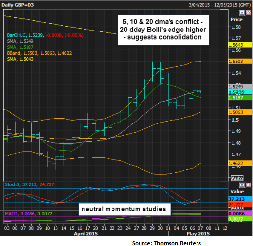 Tight Asian range - opened +0.4% amid broad USD weakness Neutral momentum studies, 5, 10 & 20 dma's conflict, Bollinger's edge higher Mixed signals suggest a period of consolidation Initial support/resistance at 1.5150/1.5292