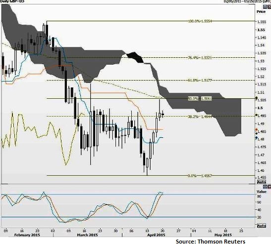 1.5053 stalled Friday ahead of key resistance 1.5061 (50% of 1.5554/1.4567). 55 DMA 1.5065. Cloud base at 1.5082 reassess should a negative cross emerge on the slow stochastic
