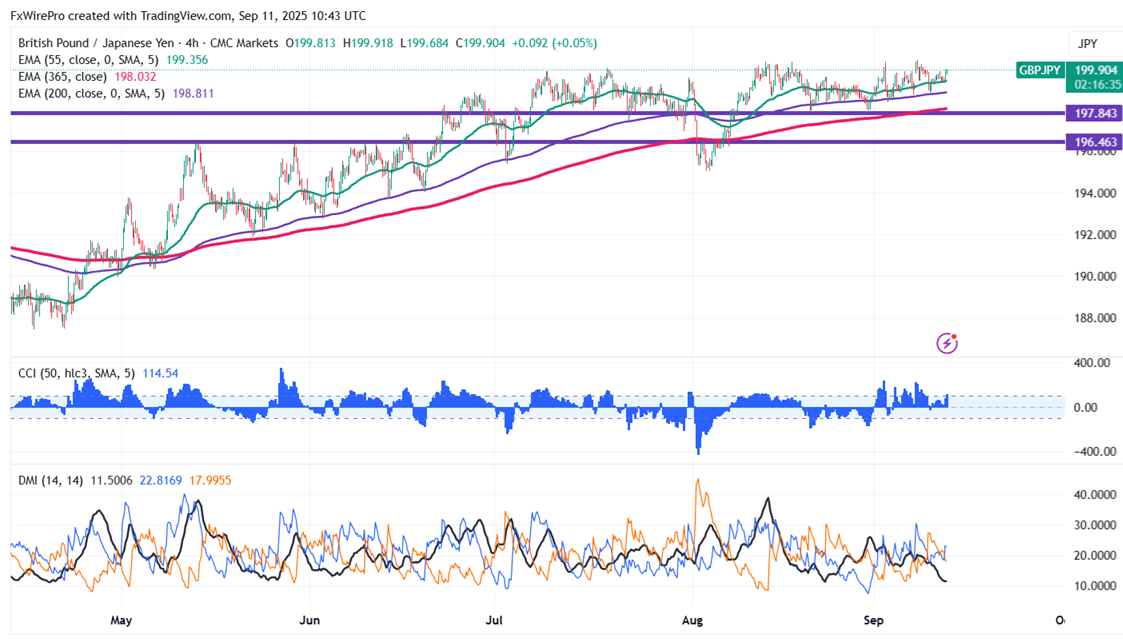 The pair is trading above 55 and 200 EMA and 365 EMA (long-term) on the 4-hour chart, confirming a bullish trend. Any violation below 199.20 indicates the intraday trend is weak. A dip to 198.75 /198/197.85/197.25/ 196.70/196.20/195 is possible. Immediate resistance is at 200.35; a breach above this level targets of 202/203.