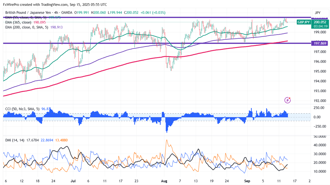 The pair is trading above 55 and 200 EMA and 365 EMA (long-term) on the 4-hour chart, confirming a bullish trend. Any violation below 199.50 indicates the intraday trend is weak. A dip to 199.20/198.75 /198/197.85/197.25/ 196.70/196.20/195 is possible. Immediate resistance is at 200.50; a breach above this level targets 202/203.