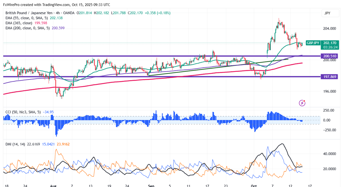 GBPJPY trades flat with a negative bias as the prolonged US government shutdown has increased demand for safe-haven assets. Intraday trend remains bearish as long as the resistance at 203.60 holds. Trading around 202.03 right now, the pair reached an intraday low of 201.63.