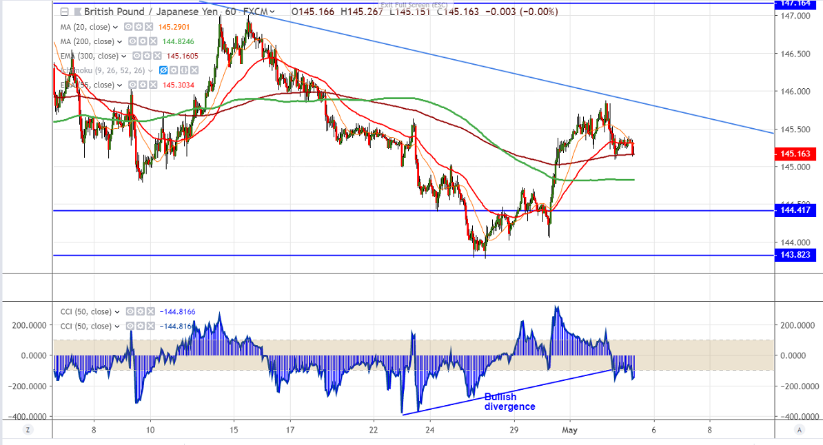 GBPJPY has halted its 1- week of uptrend and shown a decline of 80 pips. BOE has kept its rates unchanged and mentioned that “Overall GDP growth appears bang in line with forecasts”. But Brexit uncertainty is putting pressure on GBP.Polls took place for 248 English councils,six mayors and 11 councils in North Ireland. Both Labor and Conservative party lost heavily in local elections held across UK on Thursday.Markets eye UK Services PMI data which is to be released today for further direction. It hits low of 145.08 yesterday and is currently trading around 145.18.