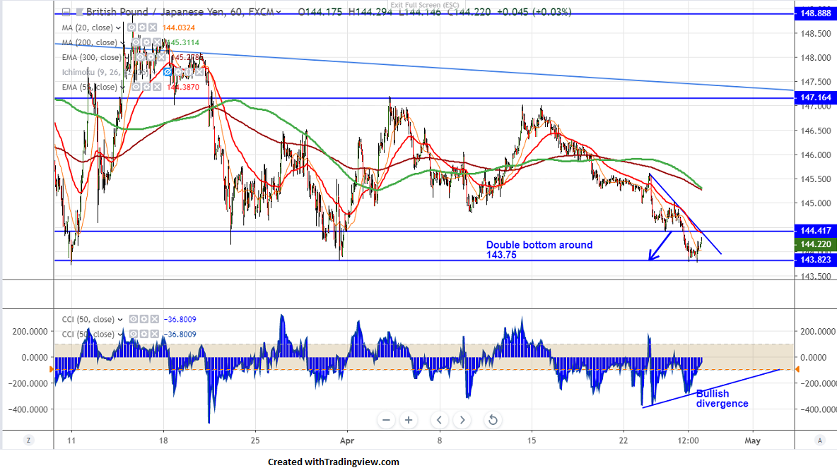 On the higher side, near term resistance is around 144.38 (55- H EMA) and any break above will take the pair to next level 145/145.28-32 (300 H EMA and 200-H MA)..