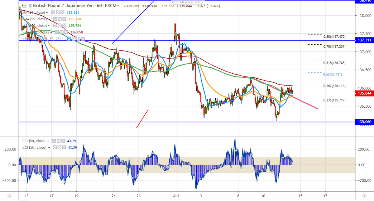 On the higher side, major resistance is around 136.06 (300- H EMA) and any violation above will take the pair till 136.45/137. Any convincing break above 137.78 confirms bullishness.