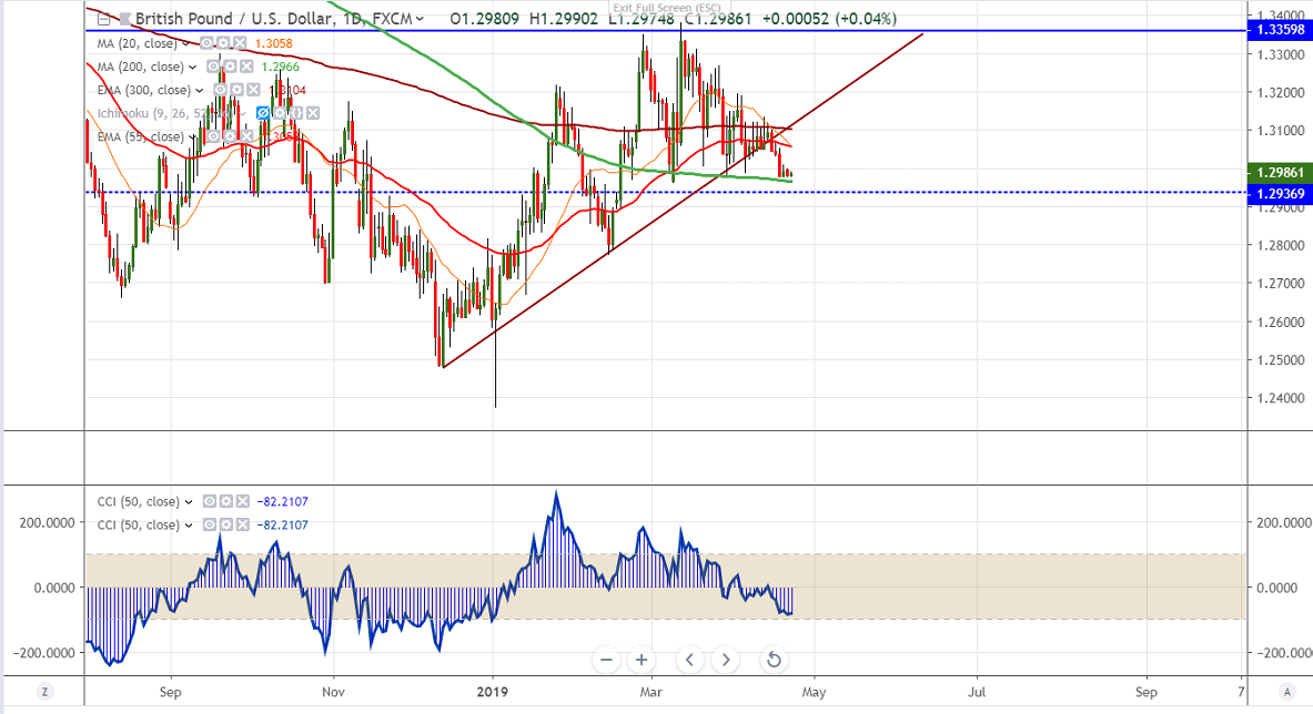 GBPUSD is trading lower for more than 1 month on Brexit uncertainties. EU and UK has agreed to extend its Brexit deadline by 6 months till Oct 31st. UK PM May is to have talks with Labor and opposition party leader Corbyn today as Parliament returns from Easter break. The pair hits low of 1.29750 and is currently trading around 1.29833.
