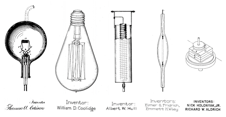 L to R: Edison’s incandescent light bulb; tungsten glowing filament; fluorescent lamp; halogen lamp; red light-emitting diode. Wikimedia Commons, adapted from patents US1082933A, US1082933A, US1790153A, US2883571A and US3476993.