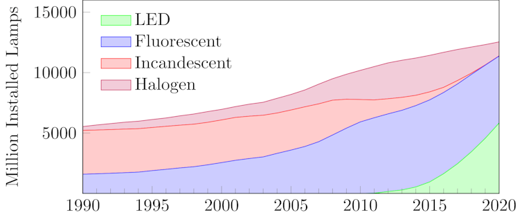 LED bulbs soon made their way into consumer’s homes, and prices fell dramatically as the LED chip became commoditised. China made a bombshell decision to enter the market around 2010, which accelerated this trend even further. The move came as part of the government’s 12th five-year industrial plan, which laid out major investments in LED research and development, as well as manufacturing capacity. A nationwide energy efficiency programme created the world’s largest market for LED bulbs and helped kickstart the industry.