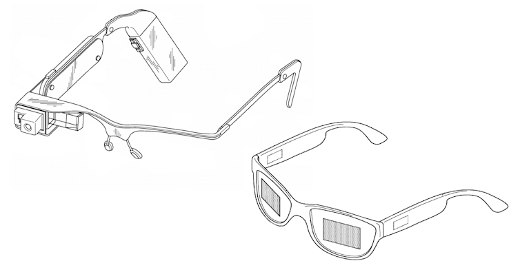Google Glass: first generation (left), using a bulky prism projection unit, and the recent evolution (right), using microLED in-glass displays. Wikimedia Commons, Adapted from patents US2017255011A1 US20130044042A1.