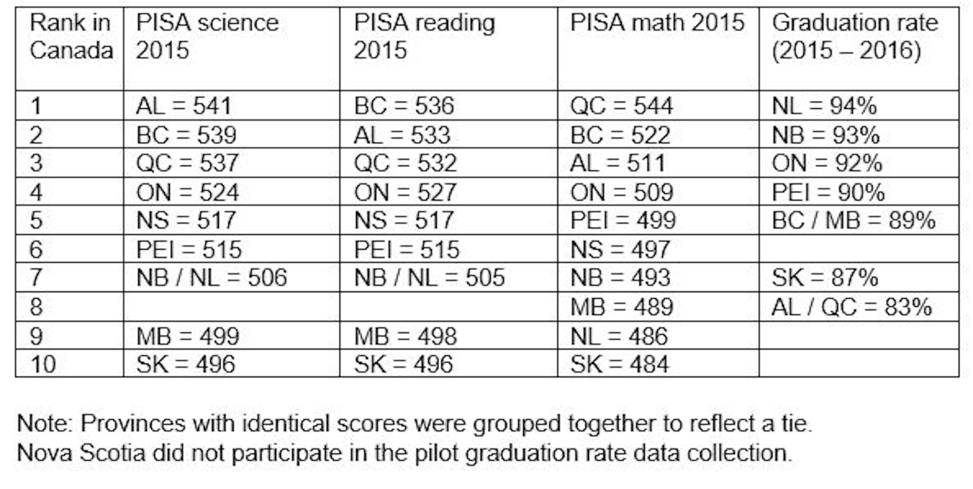 The table below shows how Canadian provinces ranked nationally in their PISA 2015 reading, mathematics and science results. (The table does not consider global PISA rankings: for example, in 2015, Alberta was first in Canada for science but Singapore was first globally.) The table also shows provincial graduation rates for 2015 and 2016 from Statistics Canada. Graduation figures reflect the extended time of up to two additional years provided to students to complete their diploma