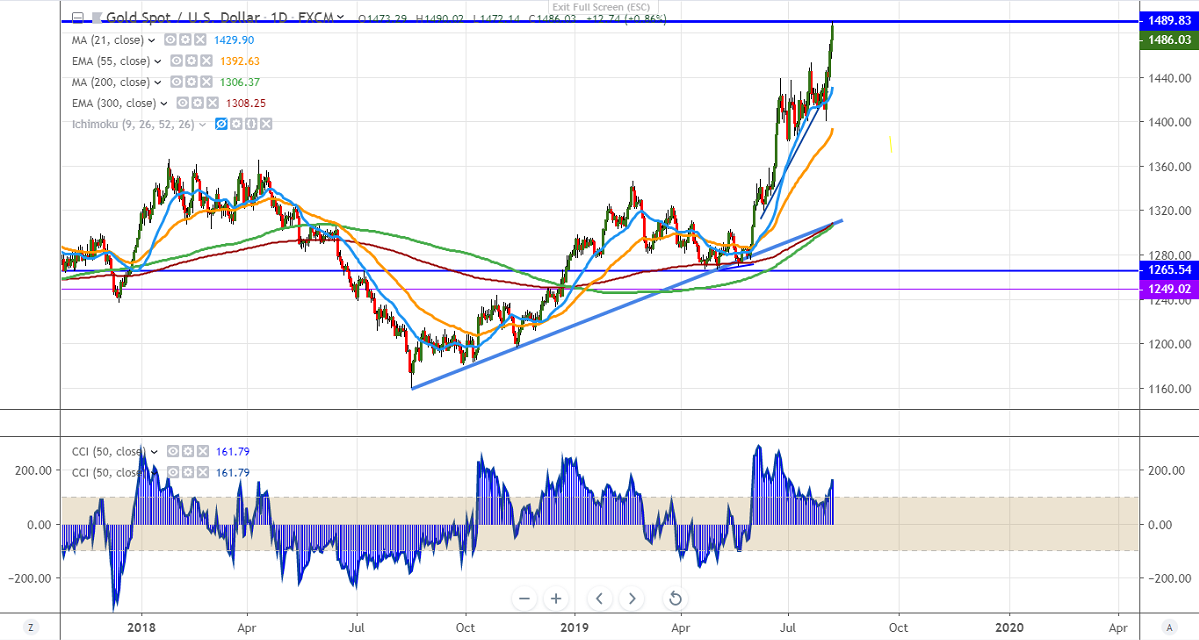Gold continues to trade higher and jumped more than $30 from low of $1456 on US-China trade war escalation and declining US bond yield. US dollar index recovery is still in bearish mode after hitting 27 months high and minor bullishness only above 98 levels. The yellow metal hits a fresh 6 year high at $1490 and is currently trading around $1482.73.