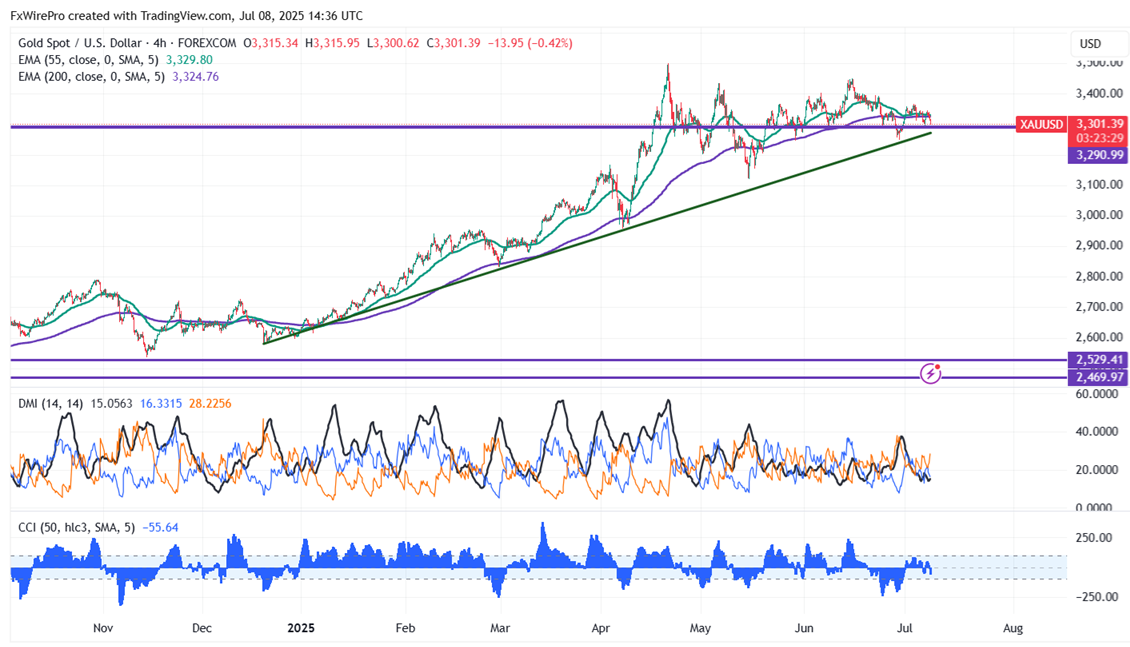 Gold pared most of its gains as a new Tariff by Trump pushed US bond yields higher. It hit a low of $3296 yesterday and is currently trading around $3310.