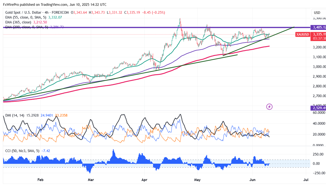 Gold prices are holding above short-term moving averages 34 EMA above 55 EMA and above long-term moving averages (200 EMA) on the 4-hour chart. Immediate support is at $3330 and a break below this level will drag the yellow metal to $3300/$3270/$3245/$3230/$3200/$3165/$3135/$3100/$3000. The near-term resistance is at $3400 with potential price targets at $3415/$3465/$3500.