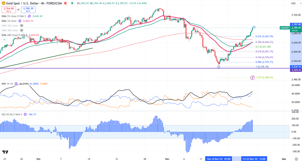 Gold prices gained sharply on easing US yields and escalation of tension between Russia and Ukraine. It hit a high of $2710 and is currently trading around $2690.