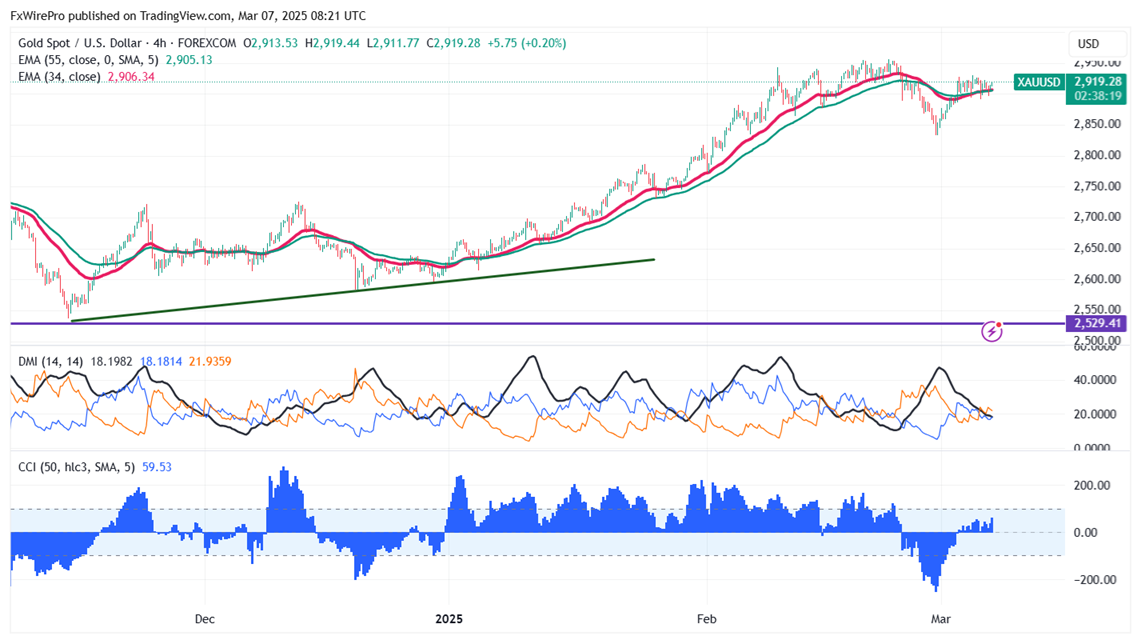 Gold prices are holding above the short-term moving averages of 34 EMA and 55 EMA and the long-term moving averages (200 EMA) in the 4-hour chart. Immediate support is at $2895 and a break below this level will drag the yellow metal to $2867/$2850/$2830/$2800/$2770/$2740. The near-term resistance is at $2930, with potential price targets at $2940/$2957/$3000.