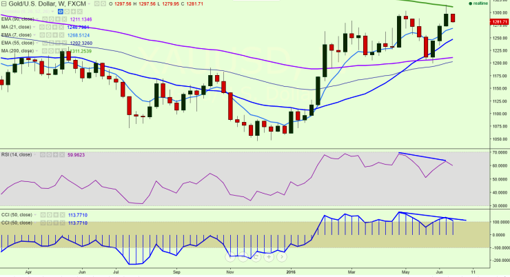 - In weekly chart CCI(50/RSI(14) have formed bearish divergence, a decline till $1245 is possible.
