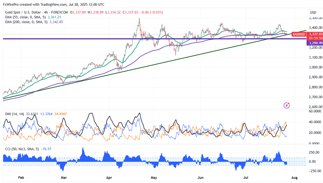 Gold prices are holding below short-term moving averages, 34 EMA and 55 EMA, and above long-term moving averages (200 EMA) on the 4-hour chart. Immediate support is at $3320, and a break below this level will drag the yellow metal to $3300/$3295/$3275/$3245. The near-term resistance is at $3345 with potential price targets at $3360/$3385/$3400/$3420/$3450/$3475/$3500/$3550.