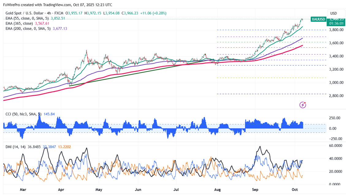 Gold prices are holding above the short-term moving average 34 EMA and 55 EMA) and the long-term moving averages (200 EMA) on the 4-hour chart. Immediate support is at $3925, and a break below this level will drag the yellow metal to $3850/$3800/ $3700/$3675/$3653/$3600. The near-term resistance is at $4000 with potential price targets at $4033/$4100.