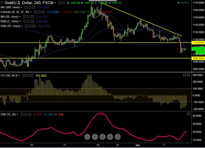Gold has broken major support $1115 and declined till $1101. It is currently trading at $1107. Overall trend is still bullish as long as support $1120 holds.