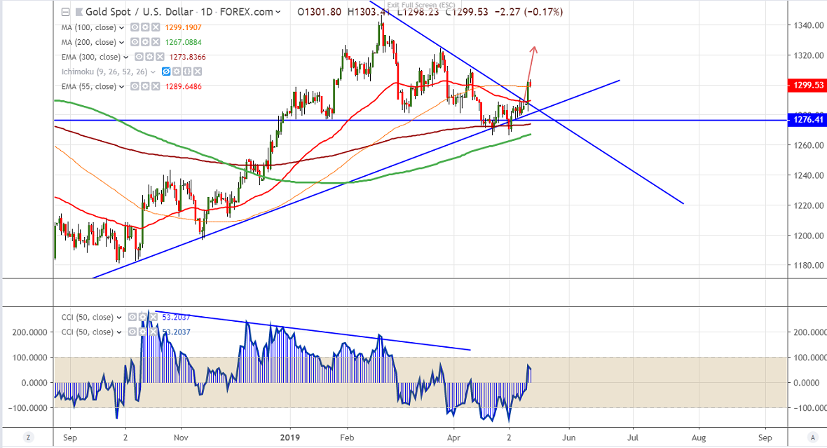 The yellow metal broken major psychological resistance $1300 and any daily close above targets $1314/$1317 (61.8% fib).