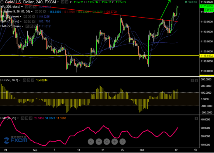 Gold is facing strong trend line resistance around $1170 (Aug 24th high) and any break above will take the pair to next level $1187.