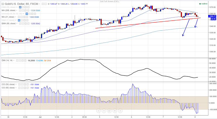 - On the higher side , the yellow metal is facing minor resistance is around $1363 (21 HMA) and any break above will take the gold to next immediate resistance at $1370/1375 (Jul 6th 2016 high).
