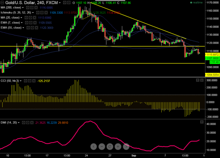 - Gold has broken major support $1115 and declined till $1101. It is currently trading at $1107. Overall trend is still bullish as long as support $1120 holds.
