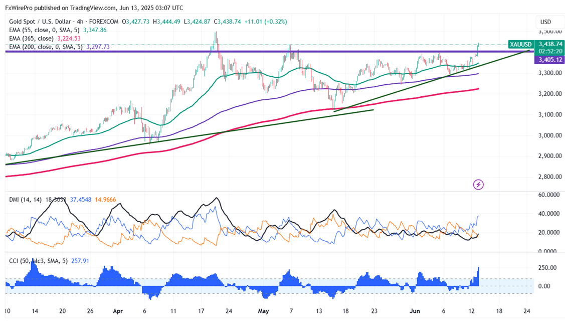 Gold climbs sharply above $3400 as Israel and Iran tensions have increased demand for safe-haven assets. It hit an intraday high of $3440 and is currently trading around $3439.