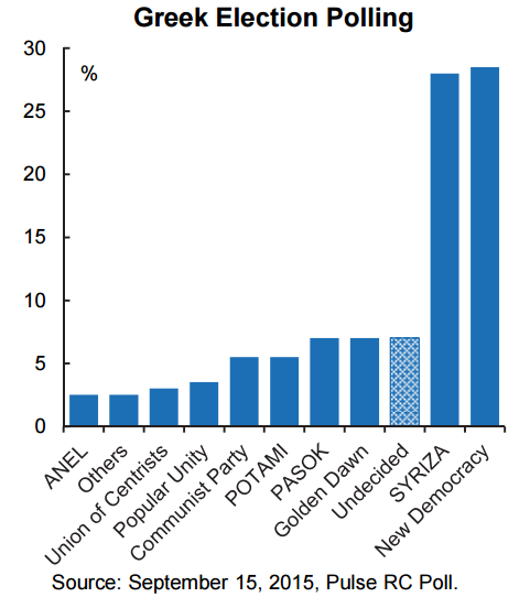 Greece faces a too-close-to-call election on Sunday and the results could well result in a hung parliament despite assurances to the contrary. The election was called when Prime Minister Alexis Tsipras resigned his post on August 11th in an effort to weed out rebels within his Syriza party (itself rather rebellious) who were destabilizing government efforts to implement the bail-out agreement reached with Europe. Since Tspiras has so vocally ruled out a coalition with his main opponent - New Democracy - it is unclear which party will be able to form a coalition with weaker partners.
