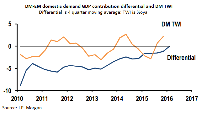 The Emerging Market (EM) has been underperforming the Developed Market since the EMU debt crisis and persistent divergence between the business cycles in both the regions has been a central feature of this economic expansion. Sustained policy support from central banks and healing in the private sectors and banking systems has helped economic growth in the DM move modestly above potential, while growth in the EM has fallen further below potential, dragged down by over-indebtedness, depressed corporate profits, and terms of trade losses.