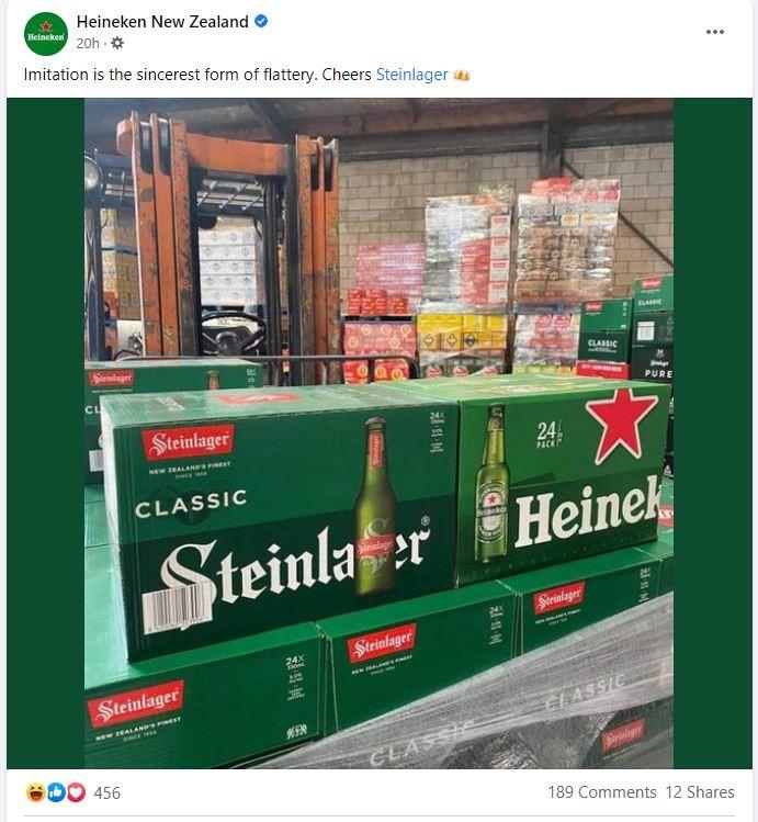 The Heineken NZ Facebook account posted a photo of its 24-pack box side-by-side with Steinlager's, which was decorated with the new branding of "'New Zealand's finest".