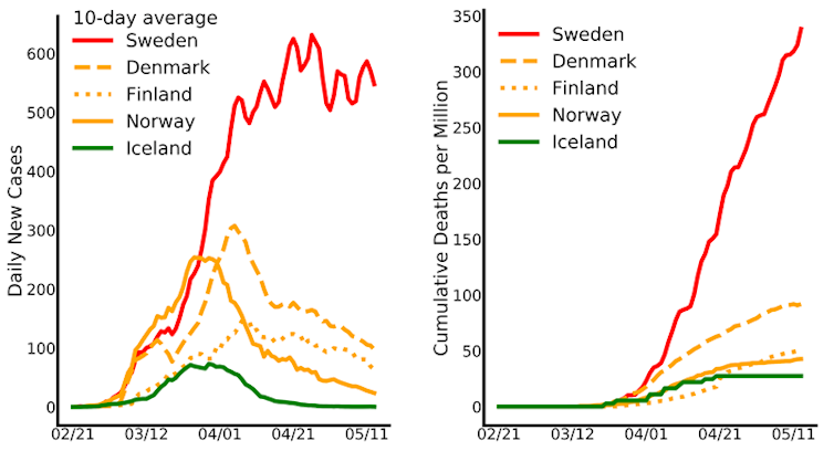 Sweden has been the poster child for herd immunity, even if it isn’t the country’s official policy. While other Scandinavian countries used lockdowns and broad public restrictions to stop the spread of COVID-19, Sweden opted for more mild interventions and personal responsibility to slow the spread. Unfortunately, their interventions have resulted in significantly higher numbers of cases and fatalities, as seen in the figure below.