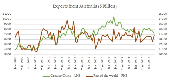 Compared to that, Australia's monthly exports to Greater China (Mainland, Macau, Taiwan, and Hong Kong) have dropped from $10.5 billion in December 2013, to $7.26 billion as of last December.
